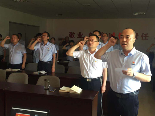 面對鮮紅的黨旗,全體黨員舉起右臂,在支部書記劉新宇同志帶領下,莊嚴宣誓“我志愿加入中國共產黨,擁護黨的綱領,遵守黨的章程,履行黨員義務,執(zhí)行黨的決定,嚴守黨的紀律......”。再次重溫入黨誓詞使全體黨員受到了一次心靈的洗禮、思想的震撼。